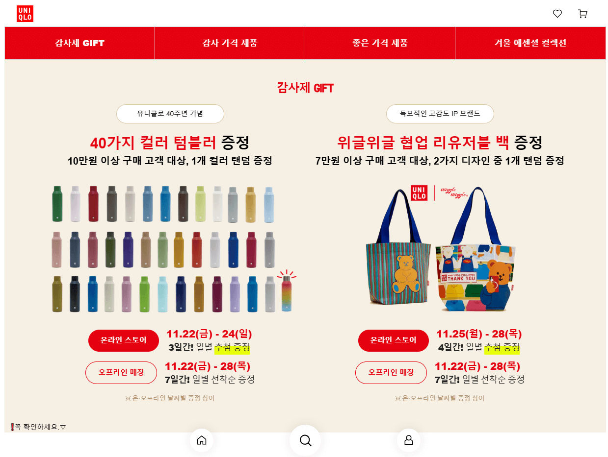 이번 11월 유니클로 겨울감사제 기프트와 4만원 모바일 이벤트, 겨울감사제 할인제품들 더 자세히 보실 수 있게 위에 버튼 해 놨습니다. 이번 기회 놓치지 마시고 꼭 좋은 구매 하시길 바랍니다.